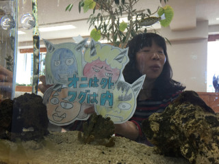 恒例行事。 スガノさん! てえへんです! 本日は節分イブです! 毎年恒例の、例のあれを! 「よし。」 そして、スガノさんはファイルを開きました。 スガノさんはファイリングなども完璧なお方です。 「貼ろう!」 「今日もフグは」の水槽がばっちり節分仕様になりました。 もしかしたら、 「向こうがみえない」ということをお思いになった方もいらっしゃるかと思いますが、なにせ、節分でございまして、なにせ、この鬼の登場は恒例行事でございまして、お許しをいただけますとありがたいです。 豆かってきて、明日にそなえなければー! もう春になるのかー。 外はさむいけど気持ちが明るくなるねー! 2015/02/02 12:51 |