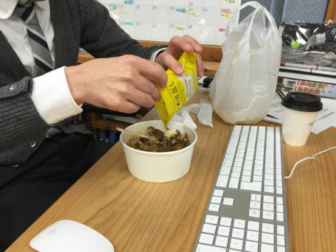 (じゃなくて! カレーの!) 私のお隣の席は、 私ども、すでにもう14年も同僚として暮らしています。 しかしながら、お隣の席になったのは初めてくらいです。 お互いに記憶をたどりましたが、 (だいぶ、耄碌している私どもですが) なかったのではないかという結論になりました。 その播口先輩は、たまに机でへんな時間にランチをたべるようです。 今日は、カレーだそうです。 カレーならば、恩返さないと! ともうしあげますと、 「手持ちがないんだよ。」 といいますので、不在の すみません、後日山下さんがカレーを食すときにお返しふりかけをさせていただきます! 「ぼかーね、かなり恩返しますよ。 かなりの恩返し家です。 家でも、レトルトカレーに、 手のひらいっぱいの量を 恩返したりしています。」 そんなONGAESERのハリーさん、いかが? 「うん。うまいよ。 というかね、 今日ぼかーはじめて このカレーをかってきたのだけど、 味見せずに恩返してしまったので、 最初のカレーが美味しかったかは ちょっとわからないな。」 とのことです。 2015/02/04 17:28 |