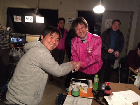 もろもろ、いろいろ えー、こちら、 さだまさしコンサート 中継チーム、本部の永田です。 今日は、なんだか 「ただいま製作中!」を荒らしてしまってすみません。 しかしですね、なんというか、本部のぼくのところにですね、 「こんな写真があるから 『製作中!』に載せといてくれ」 みたいな感じで、あちこちから写真が届くんですよ。 ああ、荒井良二さんは横田屋本店に。 お、糸井さんも、気仙沼に到着ですね。 手に持ってるのは、福島の桃ジュース? それから、中継ルームの貼り紙もいい感じで仕上がってますよ、と。 あと、 わ、気仙沼市の副市長、大江さんです。 大江さんは大のさだまさしファン。 同じくファンの 2015/03/10 15:50 |