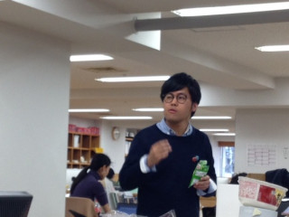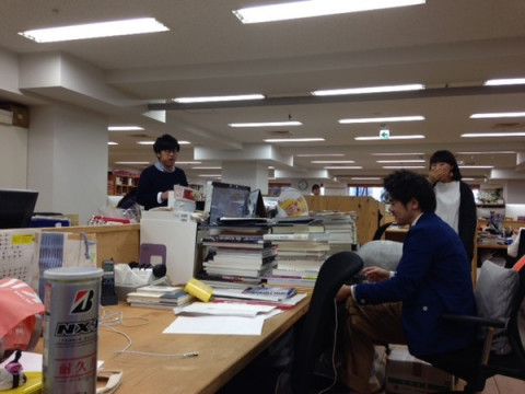 暑くないっすか?マン パソコンを見ていたら、急に気配を感じました。 ふと横を見ると、同じ島の岡田が、横に立っています。 早口で、何かを言っているのですが、あまりに唐突だったので、わたしは聞き取れませんでした。 よくよく聞いてみると、 「暑くないっすか? 暑くないっすか?」 と、言っています。 「うん」 と言う前に、すでになにかを差し出しています。 「暑くないっすか?」 と言いながら、何かをすすめてきます。 アイスの実のキウイ味を、島のみんなに、 「暑くないっすか」と言いながら、配り歩いていました。 一通り、味の感想などをのべあい、ふっと笑うおっくん。 嵐のようにやってきて、去ってった、 「暑くないっすか?」が妙におかしくなっちゃったみたいです。 2015/03/20 17:26 |