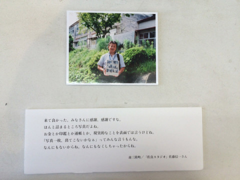 お茶会やってます。 2013年の「HAVE A NICE T!」や昨年の「FAV & PLAIN」でごいっしょし、それがあんまりおもしろかったので、勝手に同志と思っている浅田政志さん。 新著「アルバムのチカラ」の出版を記念した“お茶会”を、都立大学のテルメギャラリーで、きょう3月29日まで開催中です。 震災以降、東北沿岸部各地で自然発生的に行われている写真洗浄プロジェクト。 「アルバムのチカラ」は、そこにボランティアとして参加した、浅田さんと藤本智士さんによる、活動の記録です。 タイトルのとおり、ふつうの人たちが自分たちのために撮った写真やアルバムの力の大きさが、ひしひしと伝わってきます。 浅田さんはずっといらっしゃって、お茶のおもてなしをしてくれますので、そのときのことを、いろいろ聞かせてもらったりするのも、いいと思います。 貴重かつ、たのしい催しですので、ご興味のあるかたは、ぜひどうぞ。 2015/03/29 10:00 |