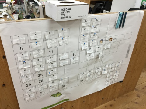 春の席替え。 はいはい、席替えです。 1年に3回、つまり4ヵ月に1回、東京糸井重里事務所は席替えを行います。 新しい席は、純然たるクジびきにて決定いたします。 「ほんとにそうやって 決めてるんですか?」とかたまに訊かれますけど、いや、もう、ふつうに真剣にクジびきです。 朝のミーティングで各自がわいわいとクジをひき、だいたいの席が決定いたしました。 ぼくのまわりはこんな感じです。 うん、通路も広めで、なかなかいい席。 窓に向かっていて、気持ちよく、寝心地もよさそ‥‥げふん、げふん。 次回の席替えは、ええと、8月だね。 2015/04/03 14:06 |