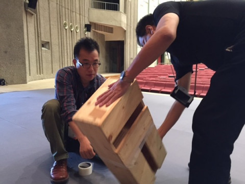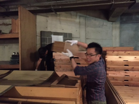 イベントのとき、ケーブルを美しくさばきながらハイになっていくベイさんですが、今日は、落語の高座をつくるための箱馬をせっせとはこび、組み立て、箱馬ハイになっていっているようです。