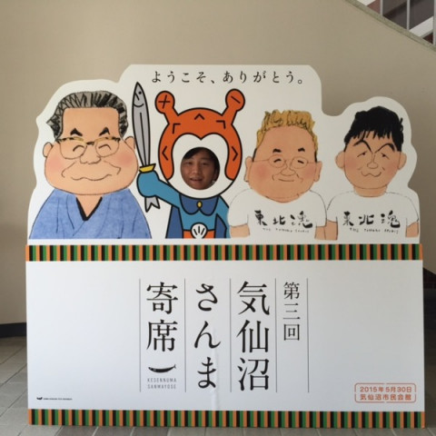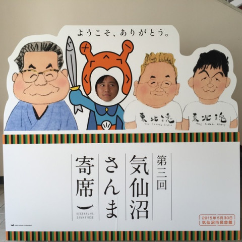 さんま寄席、記念撮影スポット 気仙沼さんま寄席のホールでは、志の輔師匠と、サンドウィッチマンさんにはさまれて、ホヤぼーやとして記念撮影ができるスポットをもうける予定です。 岩黒&西田ペアの力作です。 ようこそ、ありがとう! ────────────────── 東京から、山下です。 気仙沼の現場から投稿された、1枚目の写真を見てむむむ、いかん!と思い、すぐ気仙沼の現場に連絡をしました。 「にしだくん、顔出しパネルは もっと、顔をぐいっと前に出して!」 というわけで再撮影したのが2枚目の写真。 ね? こっちのほうがおもしろいでしょ? さんま寄席にいらっしゃるみなさんも顔出しパネルでは、遠慮なく顔をぐいっと前に出してクオリティアップを! 2015/05/29 15:34 |