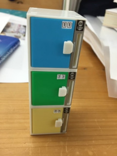 ガチャガチャから出てきたもの。 本日から開催の 「コップのフチ展」に設置されているガチャガチャマシンをまわしたくて コップのフチ展自体は19時までオープンしているのですが、32台のガチャガチャマシンコーナーは16時30分までとのことなので、ちょっと急いで行ってきました。 行く途中、 にばったり。 何買ったんですかー? 「太陽の塔のフィギュアがほしくて3回まわしたんですけど‥‥岡本太郎さんのフィギュアが2個、ピカチュウが1個でてきました。 また今度チャレンジします」 わたしたちもチャレンジ! 「スマホのおふとん」、私がほしいのは 「コインロッカー」。 それぞれ、目当てのものをゲットして、大満足です。 オフィスに戻ってすぐ、ゲットしたコインロッカーを並べてみました。 うん、いい感じ。 気に入った〜。 「スマホのおふとん」もなかなか味わい深いです。 ブルーのおふとんは清潔感がありますね。 さっそく寝かせてあげましょう。 1枚目=熟睡中のiPhone。 2枚目=寝相の悪いiPhone 3枚目=消しゴムにふとんを奪われぼうぜんとしているiPhone。 いろんな写真を撮って遊んでいたらわたしもこのおふとんがほしくなってきました。 明日も行こうかな〜。 2015/07/10 19:11 |