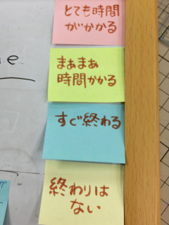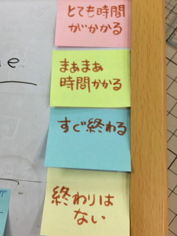 終わりはない ほぼ日オフィスに入ってすぐ右にデザイン系のアルバイトさんたちが作業しているスペースがあります。 そこには、現在未来に動く仕事の 「things to do」的な表がかかげてあります。 付箋の色によってそれがどんなボリュームの仕事なのかわかるようになっており、また、それを誰が担当しているかがわかります。 「みんなで」という欄もあります。 で、この付箋の色は、 「とても時間がかかる」 「まぁまぁ時間かかる」 「すぐ終わる」 「終わりはない」 で分かれています。 貼ってある順番で推察するに、 「終わりはない」はしかたなく後づけされたのでしょう。 私は、 「終わりはない」がさっそく貼ってあるのに気づきました。 とてもこわいです。 2015/08/12 12:27 |