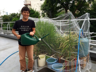 本日の稲くんたち。 いっときの猛烈な暑さがここ数日、おさまっている青山です。 ベランダで育てている稲くんたちも実りの秋へ向けて最後の成長段階に入っているご様子。 もう、13ある「田んぼ」からはすべて穂が出まして、ごくごくと水を飲んでおります。 最近は、実をついばみにスズメさんがいらしてるようなのでわるいんだけど全体的にネットを被せました。 こういう工夫&改良は、すべて 「おらが村のカールおじさん」ならぬ 「ほぼ日のイーネおじさん」 通常業務である「経理」の合間にやっているみたいなんですよ。 しかも 「そういえば ネットかけときましたから」 という事後報告をLINEで送ってくるんですよね。 で、「え、マジすか?」と言って見に行ってみると田んぼの様子がガラリと変わってる。 いやあ、おもしろい人です。 さて、みなさんのおうちの田んぼは、どうですか? もしよければ、様子を写真に撮ってpostman@1101.com まで送ってもらえるとうれしいです。 2015/08/12 16:35 |