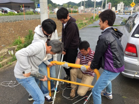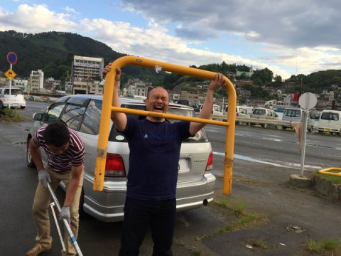 気仙沼さんま寄席では、大人数人でも抜けなかった車止めの柵を「ふんっ」と、鼻息いっぱつ、ひとりで引っこ抜きました。