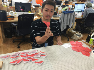 「いやー、それがですね、 機械というものは、 四角いものを 四角く折るのはできますが、 四角いものを 三角に折ってはくれないのです。」