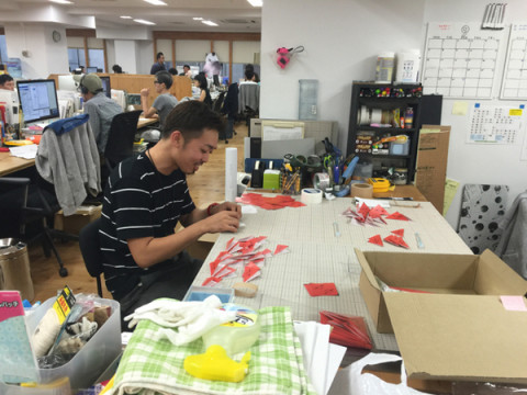 「手帳のことば展」で不思議な球体の中にいれる紙を加工しているところでした。