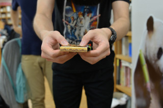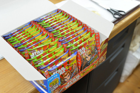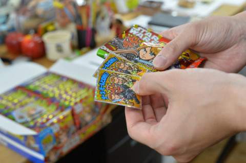 おすすめ劇場金曜版 ハリーからの原稿催促に茫然としているととなりにものすごい笑みの青年が立っていました。 アルバイトの なぜか、ロボットのような動きでデザイナー もしかして、おすすめ劇場? 「そうです。 スガノさん、ビックリマンチョコは 好きですか」 大好きです。 「差し上げますので召し上がりませんか。 ごらんください、まずこのめずらしい ロッテのテープを」 (4枚目の写真) は、はぁ‥‥。 もしかして箱買いしたの? 「はい、このようなかたちで コンビニで販売されています。 なぜこれがこのように売られているか、と お思いでしょう。 それはこの中にスターウォーズのシールが 入っているからです。 いちまい開けてみましょう、ほら。 はい、このようにシールが入ってますが、 がくーーー」 なんなの。 「また、同じシールが出てしまった」 「この箱はじつは第2弾で、 タカヤくんは、第1弾のシールも こんなに集めているんですよ」 (下から3枚目の写真) 怖。 「スガノさんは チョコがお好きだと聞いたので なかみをさしあげます。 なんならあと29枚ありますので いつでもおっしゃってください」 (おむかいの席から) 「そのシール、 ゲームボーイのソフトの箱が 収納にぴったりだと 聞いたことがありますよ」 「おお! なるほど! それはいいですねぇ〜」 なんじゃ、その同意は。 ‥‥わからない。全体的にわからない! でもビックリマンチョコはおいしいです。 いつでも食べますので、このブームをつづけてください。 2015/10/02 19:32 |