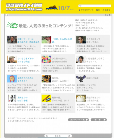 人気のあったコンテンツ。 みなさま、 「ほぼ日」のホームの日付の下に 「最近、 人気のあったコンテンツ。」があるのはご存知でしたかー? ひっそりと便利なこのページ、クリックするとシャッターがぺろんとおります。 そこには、最近人気があったコンテンツが12ばかり並んでいます。 ただいま一番古いコンテンツが、8月の20日に終了した 「渡辺真理さんの お菓子食べ部。」です。 ELTの持田香織さんと渡辺真理さんのお菓子にまつわる(だけじゃない) おしゃべりが掲載されています。 つまり、そこから現在までで人気のあったコンテンツがリストになっている、というわけです。 連載期間が短かったものなどもありますので、読み逃したものがあったら、ぜひ、こちらからどうぞ! 2015/10/07 20:12 |