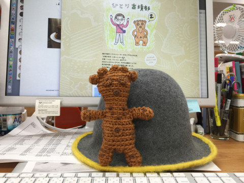 10月22日〜26日。 今日帽子作家のスソアキコさんの個展 『古墳と山高帽』のお知らせをアップいたしました。 場所はTOBICHI2。 1Fに古墳。 2Fに帽子です。 (帽子は販売いたします。) ただいま、スソさんは個展の準備におおわらわでございます。 ときおり事務所にこられて、顔出し看板の顔の位置の指定などをして風のように去っていきます。 そして、この忙しい折に、 インスタグラムもはじめたのだ、とお知らせをもらいました。 「どうも、写真が上手にとれなくて なかなかアップできない」 とボヤいておられましたが、ただいま、かわいい帽子と、ミミズク土偶のミミケンが写っています。 ちなみに、あみぐるみのミミケンは、ただいま、弊社に滞在中です。 スソさんのお友達がつくってくれたのだそうです。 いつか、編み図を‥‥つくろうかな。 2015/10/08 10:56 |