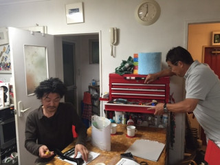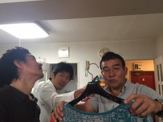 悩む男子。 ハラマキの商品の撮影でショーパン王子としておなじみの大江さんのスタジオにきています。 (大江さんは、春〜秋前くらいには、毎日ショートパンツで過ごされます) 今日もお天気がいいので、ショートパンツで来ようかと思ったけどご家族に止められたそうです。 夜になって、冷え込んで来たから、よかったですね。 ハラマキシリーズの新商品の撮影の仕方を、男子たちがああでもないこうでもないと、工具を探したり、切ったり貼ったりしています。 わたしは女子なので、おとなしくしています。 フレーフレーみんな! 2015/10/26 19:21 |