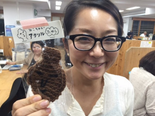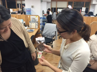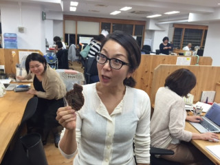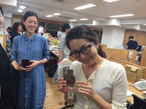 シオリ劇場・たわし編 今日はスガノがおやすみなので、代わりにシオリ劇場をおとどけします。 ものすごく表情豊かに隣の席のスガノにいろんなお菓子をおすすめする 「聞いてくださいよ〜、 わ・た・し、 た・わ・しが当たったんです!」 わたし、に、たわし! んん? それ、どういうこと? 「知らないんですか? ミコちゃんたわしですよぉ〜。 この前の『古墳と山高帽』展の、 『ハニワ写真コンテスト』で わ・た・し、超がんばって、 みごと入賞したんです!」 あ、それはスソさんの作ったハニワの顔出し看板でいかにおもしろい顔の写真を撮れるか、というアレですね。 「そそ、わたし、こういうの大好きで。 じぶんのさいこうの変顔で写ったら スソさんに選ばれて、 タワシ賞をもらっちゃったんです! ジャーン。かわいー」 あ、いいなー! ‥‥で、その入賞した変顏って、どんなものですか? 「いーやいやいやいや、 全国にこの顔は、見せられない! もう、ひどすぎて‥‥クフフ!」 と、いうわけで変顔は見せてもらえなかったのですが、タワシとのノリノリツーショットを撮らせてもらいました。 (この顔はふつうだそうです) うーむ、見たかったなあ‥‥。 ちなみに「ハニワ写真コンテスト」、ほかにも何人か入賞者のかたがいらっしゃって、後日、ご連絡が行くそうですよ〜。 以上、シオリ劇場・たわし編、でした! 2015/10/27 18:49 |