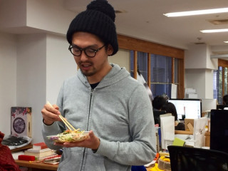 痩せた人 最近痩せたらしいと評判のデザイナー サラダを食べているようです。 「炭水化物を食べる量を 減らしたんですよ。 どこか1食を、炭水化物抜きにすると 調子いいですよ。 正直、これまで食いすぎでした」 そうなんだー。 「今日のお昼はサラダですが、 朝晩はしっかり食べてるので 心配しないでください。 炭水化物を減らすと、 頭の回転がはやくなりますよ」 「朝、はやく起きれたりとか?」 (いただきもののスナックを食べながら) 「いや、朝は起きれない」 なんで、平本くんは、話しながら移動して 「なんでかって、スガノさんが 写真を撮るから」 炭水化物を減らしたからといって頭の回転がよくなってはや起きしたり机の整理整頓ができるようになるわけではないようです。 2015/11/04 13:40 |