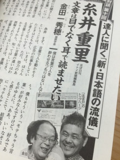 金田一秀穂先生と対談。 ただいま発売中の 『文藝春秋』12月号で金田一秀穂先生の 「達人に聞く 『新・日本語の流儀』」 というシリーズにお招きいただき、 金田一先生が糸井のことばについて質問されること、糸井が答えることのかけあいは、金田一先生がふともらした 「とても正直なんですね、 糸井さんって。」 という感想に凝縮されているようなおもしろさがありました。 おじいさまの代から金田一先生のファンでおとうさまの本を読んで大学の進路を決めたという よかったら、対談、ご覧になってください。 2015/11/11 16:36 |