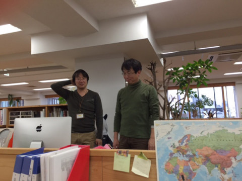 パソコン問題退治 がやってきました。 「スガノのパソコンが なんだかずっと調子わるい問題」、まだまだ続いているようです。 「今日は、諸悪の根源を退治しに やってきました」 「ま、できたらいいけど、 やってみないとわからない。 ダメかもしれない」 そうして 「ホワッ」と掛け声をかけて、スガノの席の下に潜ってゆきました。 ガサゴソ‥‥ガサゴソ‥‥ ぱっ。(ふたりで首を出す) 「あぁ‥‥これは‥‥」 「これたぶん、 ◎☆*※□‥‥(宇宙語でわからず)」 数日の出張は、パソコンの不具合を解決するのに絶好の機会ですね。 スガノさーん、ただいま日本は宇宙部奮闘中です。 詳細はまったくわかりませんが、なんとなく前進している感じなので、安心して、シンガポールでたくさん食べてきてくださいねー。 2015/11/17 15:08 |