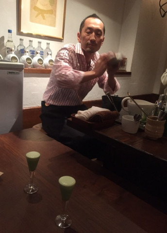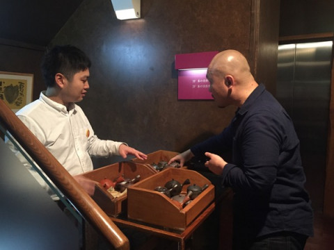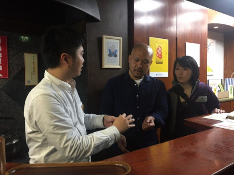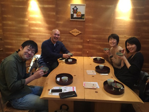 ひょんな話から、またまたうおがし銘茶さんの茶遊会に社内のお茶好きメンバーと行ってきました。 まず、よくほぼ日のにほん茶を飲んでいるという (特にイサワは、私が社内用に買った急須が所定の場所になく、どこだどこだと探していたらだいたいイサワの机でみつかる‥‥というくらい、よくデスクでお茶をいれているみたいです) それから、プライベートでも、よくうおがし銘茶さんを訪れてお茶を買っているという 「製作中を見て 茶遊会に行きたくなりました!」 と言ってくれたアルバイトの せっかくなので、みんな揃って行ってみましょう。 次の茶遊会は年明けだし、ことし最後のチャンスです。 シンガポールのメイツ達に負けないくらいおいしい思いをしてきましょう! まずは茶がゆをいただいてお腹を満たしたら、いろいろな煎茶や抹茶をいただきます。 みんなの心をぐっと掴んでいたのは、お茶屋さんがバーテンダーに扮して作ってくれる甘いカクテル「抹ティーニ」。 「これ、もう一度飲みに来たい!」と、みんなノックアウトされていました。 ドイツ育ちの 「バウムクーヘンを焼く」という工夫にへぇ〜!とびっくりしていました。 (香ばしさが増して、 お茶とよく合いました。 うおがし銘茶の和菓子担当の方の アイデアだそうです) おいしいお茶のいれかたもその場で教えていただきました。 お茶屋さんがお茶をいれる所作は、何度見ても、ほれぼれするくらい、かっこいいなぁと思います。 帰り際、 急須はなるべく 小さめのものがいいのですが、体も手も大きいイサワが持つと、なんだかオモチャのようです‥‥。 茶遊会は土曜までです。 みなさん、ぜひ、行ってみてくださいね〜。 ーーーーーーーーーーー 茶遊会 うおがし銘茶 築地新店「茶の実倶楽部」 11月16日(月)〜21日(土) 1階〜5階 お一人様 700円11:00〜17:00(最終日は16:00まで) アクセスはこちら ーーーーーーーーーーー 2015/11/19 19:11 |