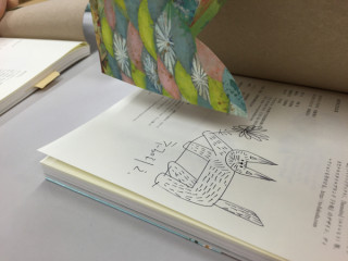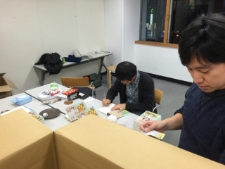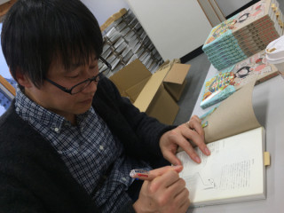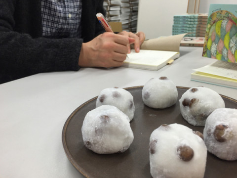 大福とサイン。 ほぼ日の会議室。 おいしそうな大福越しに見える手は‥‥? 先ごろ「大福田展」を終えたばかりの福田さんの魔法の手です。 サインをしています。 するすると、かわいいイラストも描いてます。 ほぼにちストアで販売した『福田利之作品集』にきょうの朝から黙々と、書き続けていらっしゃいます。 ほんとうはですね、 「大福田展」の会期中に会場ですこしずつこれを書いていく予定だったのです。 ところがあまりに盛況で、その時間を確保するできなかったため、本日こういうことになった次第。 がんばれ福田さん。 あとだいたい200冊! ※ほぼ日ストアでご購入のお客様には すでにメールでお伝え済みですが、 上記のような事情で 明日からの発送になりました。 申し訳ありません。 いましばらく、お待ちください。 おやつ食べながらがんばれ福田さん。 あとだいたい197冊! 2015/12/07 17:25 |