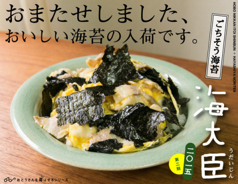 「海大臣」追加しました 先週から販売を開始したごちそう海苔「海大臣(うだいじん)」。 週末にいちど完売してしまったのですが、林屋海苔店さんが休みを返上して焼きの作業をがんばってくださることになり、また少し、販売数を追加できることになりました! 林屋さん、ありがとうございます!! 築地のお店ももう寒くなってきましたが、風邪など引かれないようお気をつけくださいね。 ところでこの「海大臣」は、ほぼ日の乗組員の中で人気No.1の商品であります。 今回も、自宅用に、年末年始のご挨拶用に、たくさんの乗組員が購入しています。 たいせつな方へのご挨拶に、 ・おいしくて ・日持ちがして ・かさばらない3点そろった「海大臣」を自信を持っておすすめいたします。 老若男女、海苔がきらいな方ってすくないですしね。 追加した在庫も、そんなに多くはないので完売してしまわないうちに、どうぞお申し込みくださいー! 2015/12/08 14:00 |