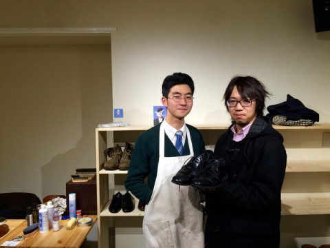 等々靴磨店、終了です。 この週末、TOBICHI2で開催されていた 「赤羽美和さんのしみしみパターン大作戦」 と「等々靴磨店」、無事に終了いたしました。 雨にもかかわらずたくさんのお客さまがきてくださり、赤羽さんのグッズは今日もたいへん好評でありました。 また、今日、山邊さんが磨いた靴は35足くらい! お昼も食べずにずーっと磨きっぱなしでした。 最後のお客さまは、長崎佐世保時代の小中学校のご友人。 赤羽さん、山邊さん、ほんとーうに、お疲れさまでした! 楽しかったです! 2015/12/13 19:51 |