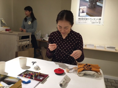 2日目オープン こちら、TOBICHIです。 本日も11時からオープンいたしましたー! 2階「すごろくやTOBICHI出張所」はトランプゲームからスタート。 いろんなゲームをやってみてわかりましたが、トランプってすごい…! 13までの数字であれだけ遊べるなんて、できる子すぎます…!! 1階では、横尾さんがチクチク作業中。 これは、急須のポッチですね! お茶を飲むとき、急須やポットの頭の部分が 「アッチアチ」になっちゃうこと、ありますよねー。 このポッチを横尾さんが編んでくれます! ポッチの大きさによりますが、2000円からです。 ご希望の方は急須のフタを持ってきてくださいね。 2015/12/23 12:23 |