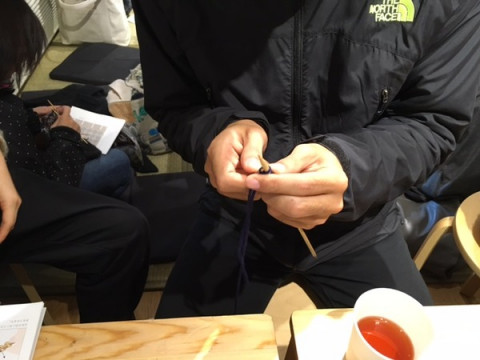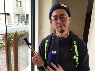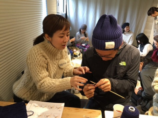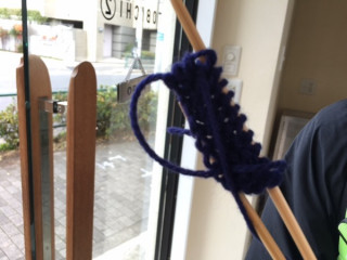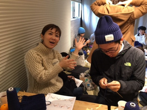 編みもの男子 こちらの男性はまさに今日はじめて、編みものに挑戦されたそうです! わー! わー! デビュー、おめでとうございます!! つくるのはTOBICHI限定販売の編み図、 「アランの帽子」です。 まずは、編みものの初歩・つくり目を田中に教えてもらいます。 こうして、こうして…。 手がまだおぼつかないようすですが、ちょっと慣れてきた、かな? そのとき、ちょうどイトイが茶の間をのぞきにきました。 「うわぁ、今日も朝から盛況だなぁ!」 そうなんです。 ありがたいことに、茶の間はつねにほぼ満席です。 イトイも、前に編みものをやったことのある編みもの男子。 今日デビューした男性に 「編みものは、ちょっと我慢しなくちゃならないんだよ」 と、アドバイスをしていました。 つぎは、編みあがったアランの帽子を被ってTOBICHIに遊びにきてくださいねー! 2015/12/27 14:33 |
