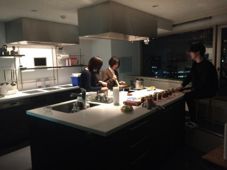 帰ろうとしてキッチンに立ち寄ってみたら真っ暗な空間に最小限の灯りをつけて、なにかをしている3人がいました。