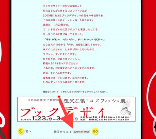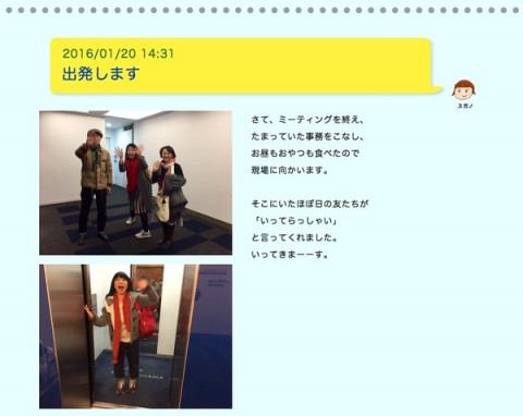 ちょっと時間がたってしまったら。 「祖父江さんのお仕事、拝見します」 のテキスト中継も本日で3日目! ずっとリロードしながら追いたくなりますがそうはいかないときもありますよね。 そんなときにはテキスト中継のちょっと上にある日付と時間が入力できるボックスをぜひご活用ください。 このぐらいの時間まで見ていたなぁ、って日付と時間をいれてGO! いちばんちかい時間の投稿までさかのぼれるので 「前へ」ボタンを必死でおさずとも見れなかった時間をすぐに取り戻せます。 ためしに1月20日13:30っていれてみたら14:31の投稿があらわれました。 おお、出発したところだ! というわけで、祖父江さん、中沢さんと尾澤さん、そして菅野さん、今日も感情移入しながらみてますよーー。 ふぅぅぅぅぅ。 2016/01/21 11:00 |