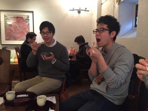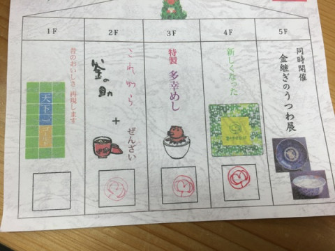 新春茶遊会 ほぼ日のにほん茶でお世話になっているうおがし銘茶さんの新春茶遊会に行ってきました。 「茶遊会」とは、うおがし銘茶築地新店にて隔月で開催されている文字通り「遊び心あふれる」お茶会です。 今回は5階で「金継ぎのうつわ展」を開催しているとのことで、先に見せていただきました。 割れてしまった器や急須が金継ぎによって美しく蘇っています。 「割れた部分がわからないように 元に戻す」のではなく、新しい作品として生まれ変わらせるという発想が素敵です。 かなり、みとれてしまいました。 そして、1つ階を降りたら茶遊会のはじまりです。 4階〜1階の各階でさまざまなお茶をいただきます。 その際、スタンプラリーのようにスタンプを押してもらうのがちょっとたのしいです。 4階では、「茶の実倶楽部」という築地新店限定のお茶とお茶菓子のセット。 3階では、香ばしい焙じ茶と、多幸めし(タコめし)の組み合わせ。 おいしいです。 しあわせです。 あまりに勢いよく食べはじめてしまって写真を撮り忘れました‥‥。 ‥‥と、ここでミラクルが! いっしょに来ていた 「お母さん!」と言うので、なんだなんだと振り返ると、なんと、 (親子ショットを撮らせていただきました) 「今日は築地に行くと聞いていたけど、 まさか‥‥」と 茶遊会が好きで、よく来られているそうです。 そして、もうひとつ個人的にびっくりしたことがありました。 それは、2階で出していただいたぜんざいの上に浮かぶ、カラフルなあられ。 これは‥‥私の地元、香川の伝統菓子「おいり」です。 お菓子担当の方が、毎回、全国のお菓子からめずらしいものを選んでいるとはうかがっていましたが、自分の故郷のものが使われると、なんとなく誇らしい気持ちになりますね。 さっぱりとした釜炒り茶とぜんざいの相性もばっちりで、とてもおいしいです。 最後は1階におりて、濃い目の煎茶をいただきます。 急須やお茶がセットになって茶箱に入ったお得な「福茶袋」もありました。 うおがし銘茶さんは、なんと今年で85周年だそう。 創業からずっとお茶ひとすじの老舗のお茶屋さんですが、いつも新しいアイデアで毎回わくわくさせてくださってさすが、としか言いようがありません。 茶遊会は土曜までです。 築地近くに来られた方はぜひぜひご参加くださいね。 ーーーーーー 茶遊会 うおがし銘茶築地新店「茶の実倶楽部」 〜1月23日(土)まで11〜17時(最終日のみ16時まで) お一人様700円 アクセスはこちら ーーーーーー 2016/01/21 20:00 |