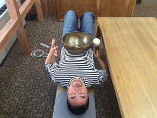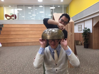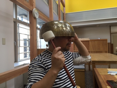 あやしいものではありません。 ミーティングをするテーブルの上にふしぎなボウルがありました。 どうやら、ネパールのもので、社長がネパールから買ってきてもらったもののようです。 軽く叩くと、それはそれはいい音がします。 さらに、周りをこすると、振動と共にまたいい音がします。 この響きと音が身体にひびいて、気持ちがいいです。 癒しの道具として人気があるんだとか? 横に置いてある本を見ると、かぶったり、体の上中乗せたりしてもいいらしく、つい、やってみるわたしたち。 みんなのお調子者度の高さがうかがえました。 お調子者だわぁ。 しかし、いい音だわぁ。 2016/01/26 20:21 |
