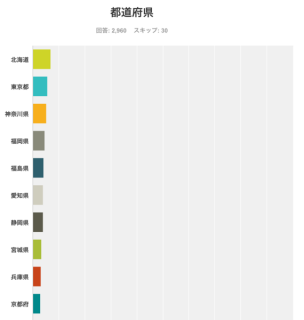 おやつ会議 2月5日まで募集している 「ほぼ日手帳 おみやげおやつアンケート」は、現段階で2,990人からご応募いただきました。 そんななか、新潟出身の 「浪花屋の柿の種を食べさせてあげたい!」 「他の県なら、ぜったい赤福!譲れない!」と手帳チームのメンバーに机をたたく勢いで力説していました。 2月の手帳ページに載せるコンテンツを考えるミーティングだったはずなのに、いつの間にか、おやつの話題ばかりでした。 おやつの魅力は偉大です。 写真のグラフは、ゆかりのある都道府県の「おみやげおやつ」の都道府県別の応募数ベスト10。 こういうアンケートって、わりと人口の多い東京からの応募がいちばん多くなるものだと思うんですが、東京をおさえて、北海道からの回答数が現在のところトップです(すごい!)。 さてさて、2月5日まで募集は続いているのでぜひご回答くださいね。 おみやげおやつの詰め合わせも当たりますよ! 2016/01/27 18:43 |