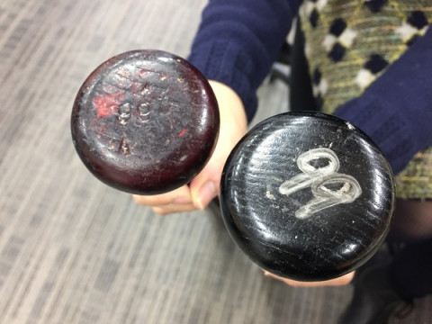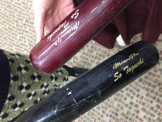 ドキドキのすぶり。 今日から連載がはじまった田口壮さんからメジャーリーグ時代に使っていたバットを送っていただきました。 背番号99。 このバットで、ホームランも打たれたそうです! 亀裂もはいっています。 さわるのも緊張します。 甲子園常連校出身で田口さんのページをデザインした テレビのなかや球場で軽々と振られている(ように見える) バット、重いです。 ふるのも難しいです。 プロ野球選手‥‥すごいです。 尊敬の気持ちをさらに高めつつ、連載の続きを、プロ野球の開幕を、楽しみにしています。 2016/01/29 19:04 |