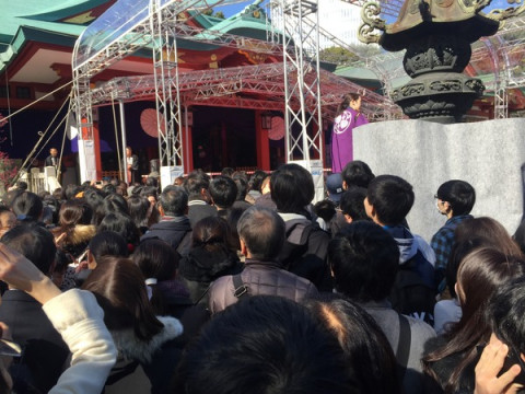 豆まき きょうはフグ水槽も 節分仕様になっているようですがわたしたち の3人も、お昼に節分祭に行ってきました。 10月の「鈴木仁子さんがつくる白磁のいろいろ展」でお世話になった鈴木仁子さんが日枝神社の節分祭で豆をまく、と聞き、 (事前に申しこめばまく係になれるのだそうです) なにそれ行きたい! 鈴木さんの勇姿を見たい! 豆まいてもらいたい! と張り切って行ってきました。 日枝神社に着くと大勢の人が豆まきを待っていました。 本殿の内側で儀式が行われている間も、豆まきを待つ人々はどんどん増えていきます。 どうやら「当たり」つきの豆もあるようで、 「このなかに豆を!」 とばかりに大きな袋を広げて待っている人もいます。 そして、豆まきのスタートです。 本殿のなかから、豆をまく側の人たちが現れました。 そして‥‥鈴木さんも、いた!!! しかしものすごい熱気です。 満員電車以上のぎゅうぎゅう状態です。 しっかり踏ん張っていないと倒されそうなほど。 猛烈な勢いで豆を受け取ろうとする人々の波に、流され、押され、一時は3人バラバラになりましたが、途中でどうにか合流。 堂々と豆をまく鈴木さんの写真をバッチリおさめることができました。 そんななか、なんと 「当たり番号」のついた豆袋をキャッチ。 縁起いいなぁ! 節分祭、たのしかったです。 頭上から豆を浴び、人々のエネルギーに元気をもらい、邪気をはらいきったようなすがすがしい気持ちになれました。 明日は立春、もう春なんですね〜。 2016/02/03 18:05 |