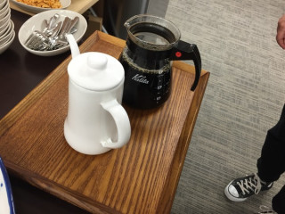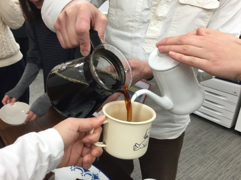 本日の宇宙コーヒー 技術系がなぜか淹れることになっている宇宙コーヒーの、本日のマスターは きっちり深煎りの豆で淹れている。それはなぜか。 持参のチョコレートケーキがあるからです。 牛乳もていねいに鍋であたためカフェオレにして提供するというのです。 なんと豪華な! みんなでおいしくいただきました。 ケーキもバッチリだったしカフェオレも最高! でした。 ちなみにあしざわのお家の方はケーキの先生なんですって。 さすがの味でした。 すてきな妻がいていいなぁとみんなにうらやましがられていました。 そういえば、うちの会社の乗組員の妻さんたちはハープ奏者、作家、造形作家、システムエンジニア、経営者、デザイナー、ケーキの先生、編集者、美人と、バラエティにとんでいます。 2016/02/12 18:05 |