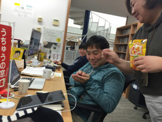 がとつぜん、島のみんなに、声をかけながら、アメをくばりはじめました。