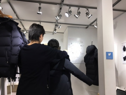 水沢ダウン試着会 そしてTOBICHIでは、水沢ダウンの試着会を開催中です。 ポカポカ陽気にもかかわらず、つぎつぎとダウンの試着にご来店いただいています。 もちろん 「ダウンがし」と名付けたわたがしもふるまってますよ。 こちらの男性はわたがしを手にしたまま、TOBICHIをあとにされました。 わたがしを持って南青山をお散歩するのもいいですね! 図ったわけではないのですが、TOBICHI、TOBICHI2のどちらも試着会になりました。 いろんなサイズを試していってください! 2016/04/08 14:07 |