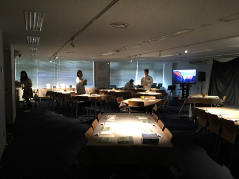 夜から始まる会合のために、キッチンのそばの大ホールでは、テーブルセッティング中でした。