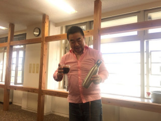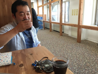 差し入れ コーヒーをいれているのかなぁ。 と、ちらっと見ていたら、こっちのほうに歩いてきました。 そして! 「エスプレッソを薄めたものだけど、どうぞ」 と言って、コーヒーをふたつ、机に置いてくれるではないですか。 うわぁ。まさかの 私と しかも、飲みやすくておいしいです。 「でしょ、南ヨーロッパが好きな人は けっこう好きな味だと思う!」 と、グルメな それにしても、この窓際の小部屋にいると、ただでさえ喫茶店でしゃべっているような気分になるのですが、コーヒーのおかげで、ますます喫茶店感が強まりました。 一息いれて、がんばりまーす。 2016/05/18 16:17 |
