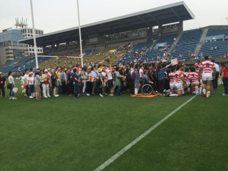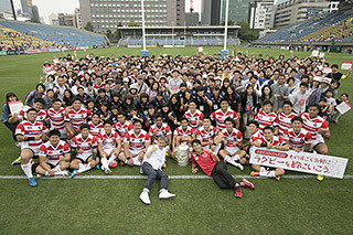 無事に終了しました! はじめて、ほぼ日が開催したラグビーの観戦イベント 「ものすごく気軽にラグビーを観にいこう」が先ほど無事に終了しました。 はじめての人も、ずっと応援してきた人も、300人がひとかたまりになってみんなで応援をしました。 香港に先制点を許す苦しい立ち上がりでしたが、一度トライが入ると、本来の力が目覚めたように点が加わっていくゲーム展開で、最終的なスコアは「日本57−17香港」! 試合終了後の写真撮影にも中竹さんをはじめ選手のみなさんとゴールポストの裏で、はいチーズ! イベントに参加した300人のみなさん、パンフレットに書かれたURLから記念撮影した画像をダウンロードできますよ。 期間限定のヘッドコーチ代行を務めた中竹さんは、明日イングランドへ飛び、6月開催のU20ワールドラグビーに向けた遠征をおこなうそうです。 なんというハードスケジュール‥‥。 観戦のレポートは、また後日「ほぼ日」でご紹介しますね。 いい写真が、たくさん撮れたんです。 参加したみなさんも、ほぼ日のスタッフも、みなさん、おつかれさまでした! 2016/05/28 18:53 |