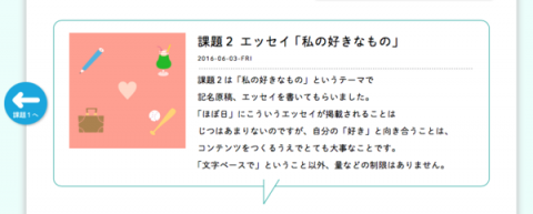 「私の好きなもの」。 本日更新のほぼ日の塾発表の広場、課題2は「私の好きなもの」というテーマの記名原稿、エッセイです。 前回は全員おなじテーマ (古賀史健さんと でも、今回のテーマはさまざまなので、メニュー画面もカラフルですよ。 例えば、カツサンド、ポルシェ、旅行、お父さん、アイドル、かわいかったあの子に夕焼けのピンク‥‥テーマも記事のまとめかたもほんとうに人それぞれな、43の記事が揃いました。 読み終えたらぜひ感想メールをお送りくださいね。 塾生さんひとりひとりにお送りします! そういえば先日の塾チームのミーティングのとき、 「私の好きなもの」という課題が出たら何について書く?という話をしたところ‥‥ 「ピーナッツ」。 「さくらちゃん!!(実家の犬)」。 「さだまさしさんかなあ」。 さいたえ(←顔アイコンがまだない) 「鳥ですね〜。いっぱい書けます!」。 4人共、即答でした。 いつか塾チームの書いた「好きなもの」も読んでみたいものだなあ。 2016/06/03 11:01 |