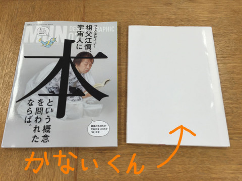 かないくんの「表4」 今日発売の雑誌 「MdN」07号は 「ブックデザイナー祖父江慎」 特集です。 宇宙人が祖父江さんに本についてたずねる、という内容なのですが ・なぜ本にはカバーがあるのか? ・なぜ片方だけ綴じられているのか? という素朴な疑問をはじめ、祖父江さんの本づくりについてまとめられたたいへん興味深い特集です。 そのなかに、祖父江さんがデザインした本や雑誌が17冊紹介されているコーナーがあって、『かないくん』も掲載されています。 『かないくん』はカバー表4側(裏表紙)になにも入れていないのでミスかと思われて印刷がストップした、と解説してくださっているのですが、雑誌誌面には『かないくん』の表4が写っていないので、ここで公開。 1枚目の写真が、それです。 絵本の後ろ側だとわからないくらい、‥‥なんか、自由帳みたいですね、まっしろであります。 『かないくん』をお読みいただければ、なぜこうなったかはお分かりいただけるかも‥‥と思います。 「MdN」の07号、 MdN DESIGNのサイトを見るだけでもおもしろいですよ〜。 2016/06/06 13:56 |