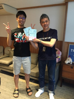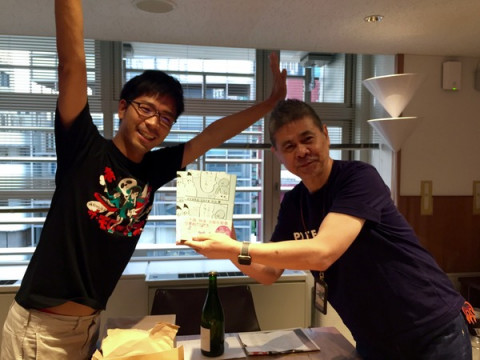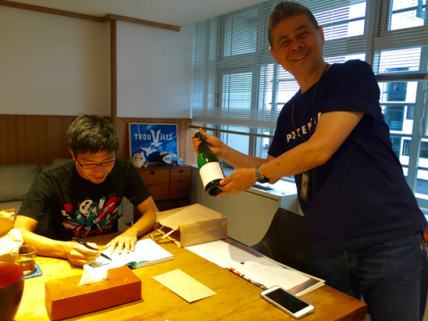 小山健さん マンガ家の小山健さんが新しく出た単行本『osaka.sora』をもって このマンガのオビに、イトイの言葉が載っているんですよ。 いままで 「イトイがサインしているところ」 は何度か見たことがあるのですが 「イトイがサインしてもらっているところ」 は、そんなに見たことがないです。 「イトイがサインしてもらっているところ」 しかもさらに 「ワインをあげると見せかけて あげないところ」 は完全に見たことがありません。 (すみません、そう書けと言われたので 書いたのですがうまく書けませんでした。 3枚目の写真がそれです) 「あれはおもしろかったなぁ、 ああいうの、もっと読みたいよ」 とリクエストしていました。 あ‥‥ここまで書いて気づきました。 あの座談会のときはみなさんの顔写真を掲載しなかったので、小山さんのお顔が「ほぼ日」に載るのはこれがはじめてかな? みなさん、この方が、小山健さんです! 2016/06/14 19:04 |