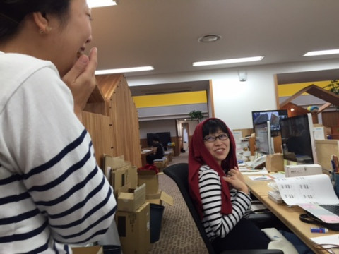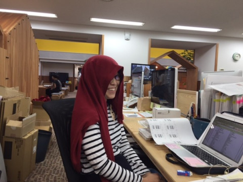 がカーディガンを頭にかぶった奇妙な格好で仕事中。