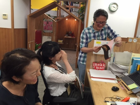 オンカさんと本 「世田谷パン祭り2015」でお世話になったパン屋さん 「onka(オンカ)」の下山さんが事務所にふらっとあそびにきてくださいました。 「本ができたので、よかったら‥‥」 とお持ちくださったのでした。 うわーい、ありがとうございます! 先週発売されたというのが 『「パンとエスプレッソと」の サンドイッチとフレンチトースト』 という本です。 (「onka」は、 「パンとエスプレッソと」とおなじ系列なのです) 今日は私服ということで、顔を隠して、パチリ。 本のなかにはおいしそうなサンドイッチのレシピが、たくさん。 さっそく弊社のみんなで、本を見ながら 「おいしそう、おいしそう」と、パンの話でひと盛り上がりしました。 (ちなみに 下山さん、ありがとうございます。 作ってみますねー! 2016/06/29 19:25 |