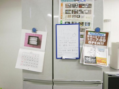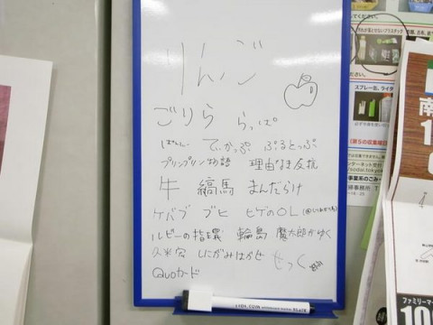 つぎは「ど」。 冷蔵庫の正面ドアは、家庭の伝言板。 ‥‥と、思うのですが、弊社でも到来物のお知らせなど、冷蔵庫に貼ったホワイトボードでお知らせされます。 今回は誰かが書いた、 「りんご (あります。食べてくださいね。)」 の書き込みから、それがいつの間にかしりとりに発展。 まったくいったい、日本でどれくらい、 「りんご」からしりとりが始まったことでありましょうか。 このしりとりのテーマは、どうやら「ノンジャンル」の様子。 これも案外、難しいですね。 仕事の合間、飲みものでもとりに冷蔵庫を開けつつ、ちょっと頭を切り替えるのに、いいかも。 ちなみに冷蔵庫にいちばん近いのは 趙さん、次は「ど」ですよ。 「‥‥‥ど。ど、ど、‥‥」 仕事中の人に話しかけちゃ、いけませんでしたね。 2009/01/23 14:34 |