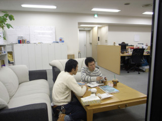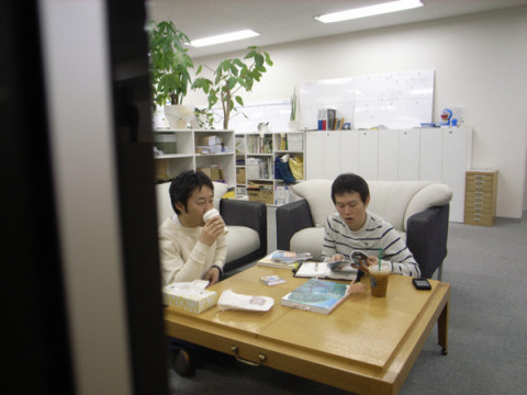 がテレビ前のソファーで、じべたにすわりながら、資料をどーんとひろげながら、なにかの相談中。
