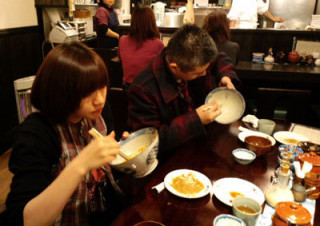 その14 長い長い打ち合わせを終えたあるプロジェクトチーム、空腹に耐えきれなくなり、社に戻る前にカツ丼をかっこんでおります。 一切れずつのカツをうなりながら大切に食べ、どんぶりの底を削るようにして米粒を惜しんで食べています。 (じゃっかん、向こう側の人が 底が見えるように傾けているのが わざとらしいのではありますが) カツ丼は、終わるのが悲しい。 カツ丼よ、今日も満足をありがとう。 ※現在「ウソの『ただいま製作中!』」を お送りしています。 詳しくはこちらをご覧ください。 2009/02/27 19:00 |