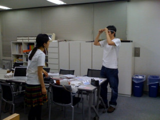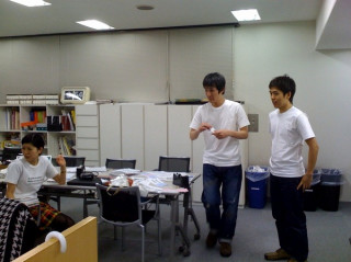 がふたりで白いTシャツを着て、なにかを検討しているみたいです。